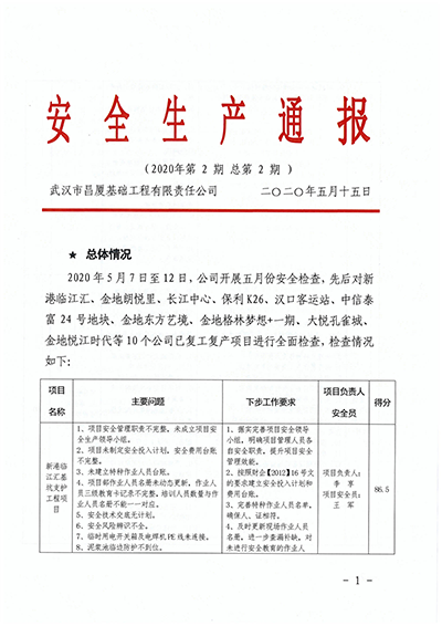 2020年5月7日至12日,昌廈公司(基礎工程公司)成立了安全質量檢查組,對復工復產的10個基礎施工項目進行全面安全質量檢查,檢查按照《基礎工程項目安全生產工作考核評分標準》和《基礎工程施工質量檢查清單》進行對標,對每個項目予以評分,確保檢查的公平和公正。在安全檢查的基礎上,編印了《安全生產通報》,對每個項目存在的問題、下步工作要求和考評得分情況予以公布,對公司整體安全形勢進行分析,提出對項目負責人和現場安全員的獎懲建議,以及下階段安全生產重點工作內容。