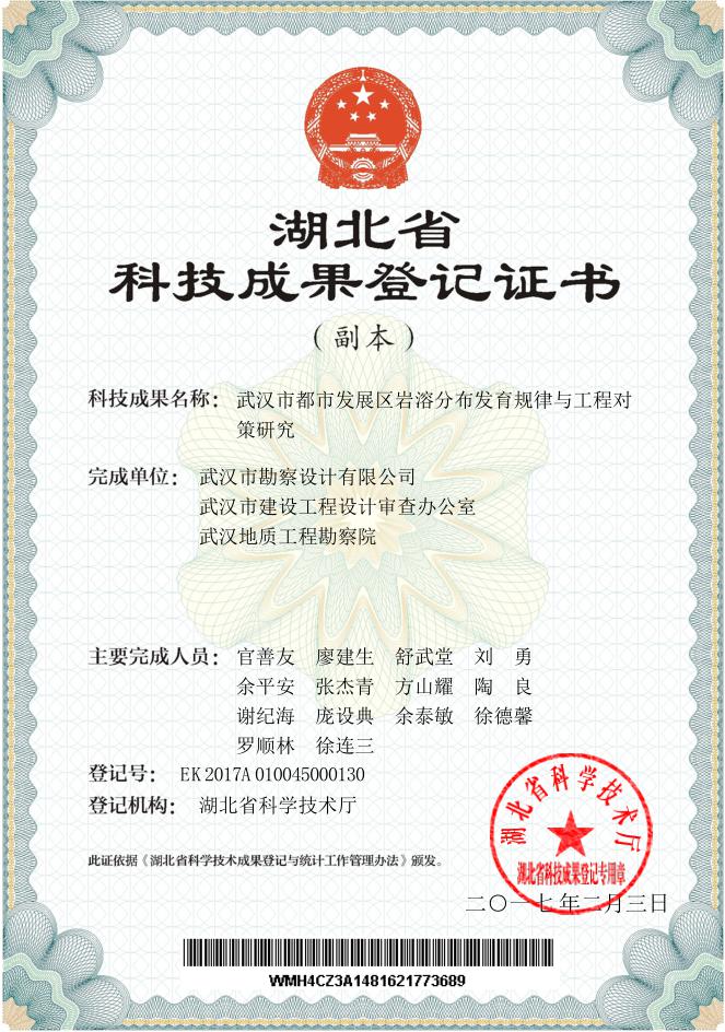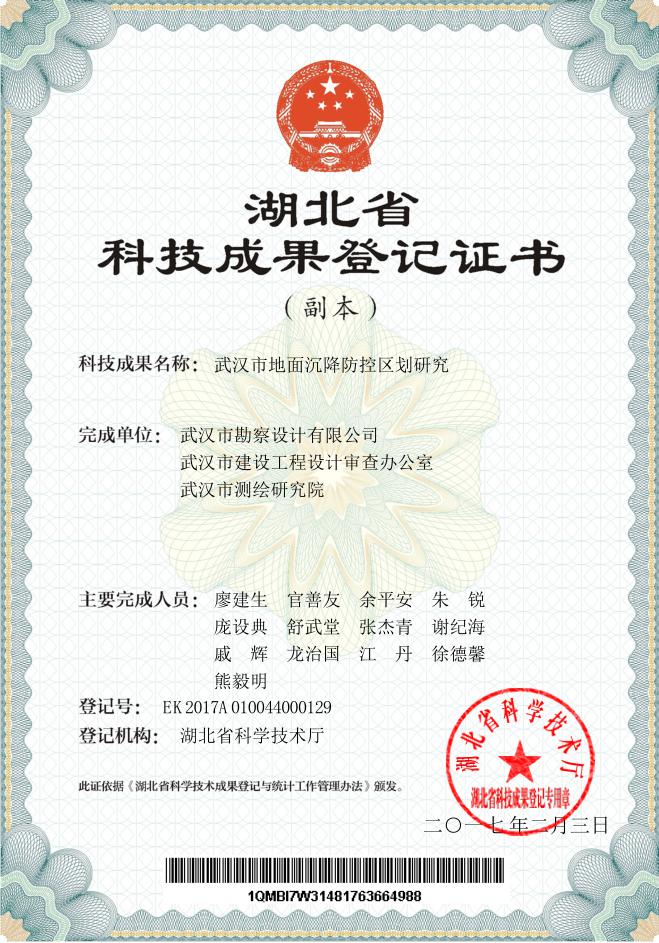 勘察公司作為地質(zhì)災害防治領(lǐng)域的技術(shù)咨詢服務公司,在市規(guī)劃局和城建委的領(lǐng)導和指示下,迅速組成以廖建生董事長兼總經(jīng)理、官善友副總經(jīng)理兼總工程師為核心的創(chuàng)新團隊,開展地質(zhì)災害防治技術(shù)和科學研究。經(jīng)過數(shù)年的深入解析和潛心鉆研,率先取得了地質(zhì)災害防治領(lǐng)域國內(nèi)領(lǐng)先的科技成果:主持的科研項目《武漢市都市發(fā)展區(qū)巖溶分布發(fā)育規(guī)律與工程對策研究》和《武漢市地面沉降防控區(qū)域研究》通過了湖北省科技廳組織的科技成果鑒定,鑒定專家委員會一致認為項目研究成果總體達到國內(nèi)領(lǐng)先水平,由省科技廳頒予《湖北省科技成果登記證書》。為武漢市地質(zhì)災害防治和地質(zhì)環(huán)境保護提供了科學精準的基礎資料、技術(shù)措施和應用成果,為武漢市生態(tài)城市建設充分發(fā)揮出了人才、技術(shù)和科技優(yōu)勢。
