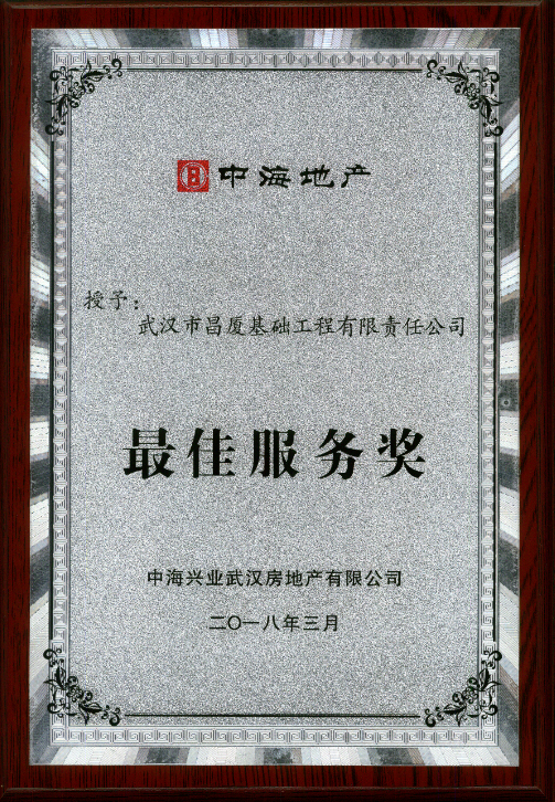 2018年3月27日,在中海地產(chǎn)武漢公司舉辦的中海地產(chǎn)武漢供應(yīng)商大會(huì)上,中海地產(chǎn)武漢公司為我司頒發(fā)了中海地產(chǎn)最佳服務(wù)獎(jiǎng)的獎(jiǎng)牌,基礎(chǔ)工程公司總經(jīng)理洪興全上臺(tái)領(lǐng)獎(jiǎng)。 昌廈基礎(chǔ)工程公司于2017年4月起與中海地產(chǎn)開(kāi)展合作,從中海光谷錦城樁基工程的小試牛刀,到...